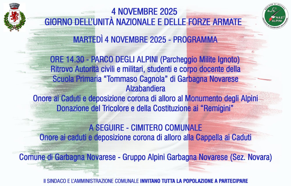 L'Amministrazione Comunale con il Gruppo Alpini di Garbagna Novarese , invitano la Cittadinanza a partecipare alla cerimonia commemorativa del Giorno dell'Unità Nazionale e delle Forze Armate .