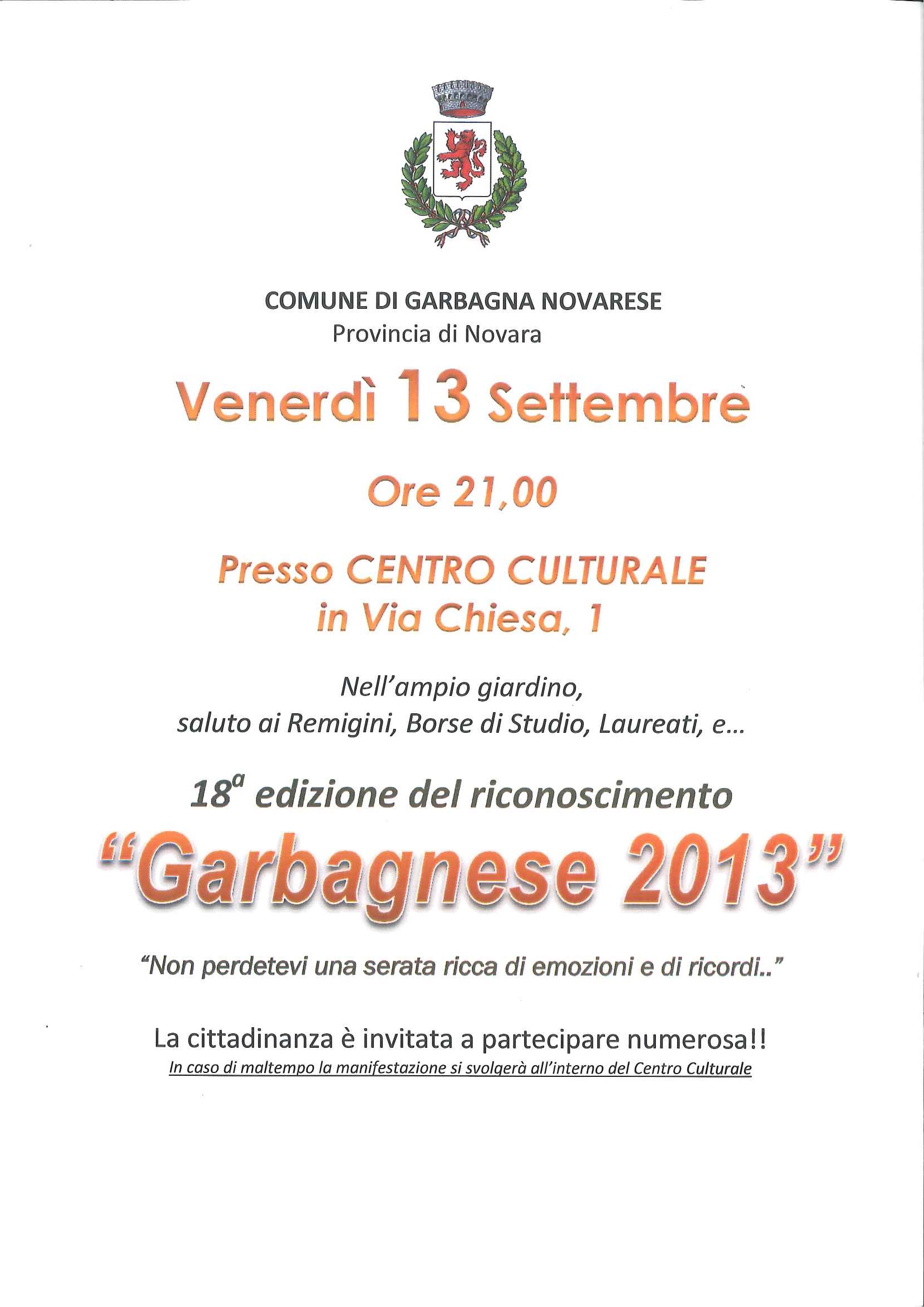 L'Amministrazione Comunale di Garbagna Novarese è lieta di invitare tutta la Cittadinanza a partecipare ai festeggiamenti per l'assegnazione del riconoscimento de "IL GARBAGNESE", che si terranno venerdì 13 settembre 2013 alle ore 21,00 presso il Centro Culturale di via Chiesa n°1.