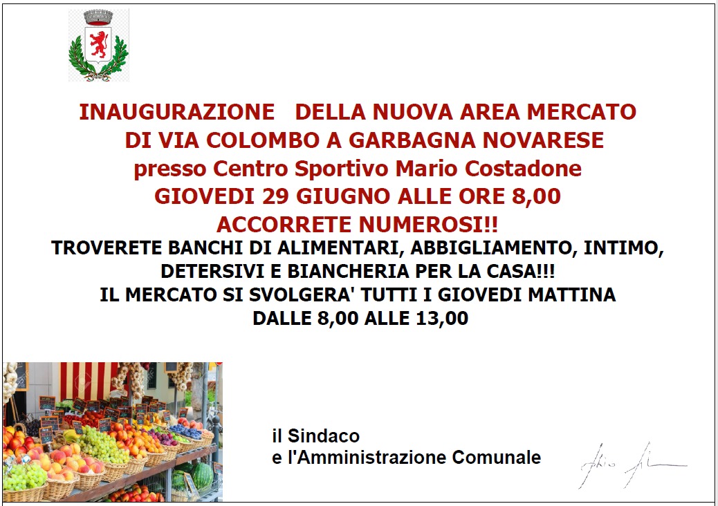 Giovedì 29 giugno alle ore 8,00 presso il Centro Sportivo Mario Costadone di via Colombo, inaugurazione dell'area mercato con banchi alimentari e non, presenti ogni giovedì dalle 8,00 alle 13,00.