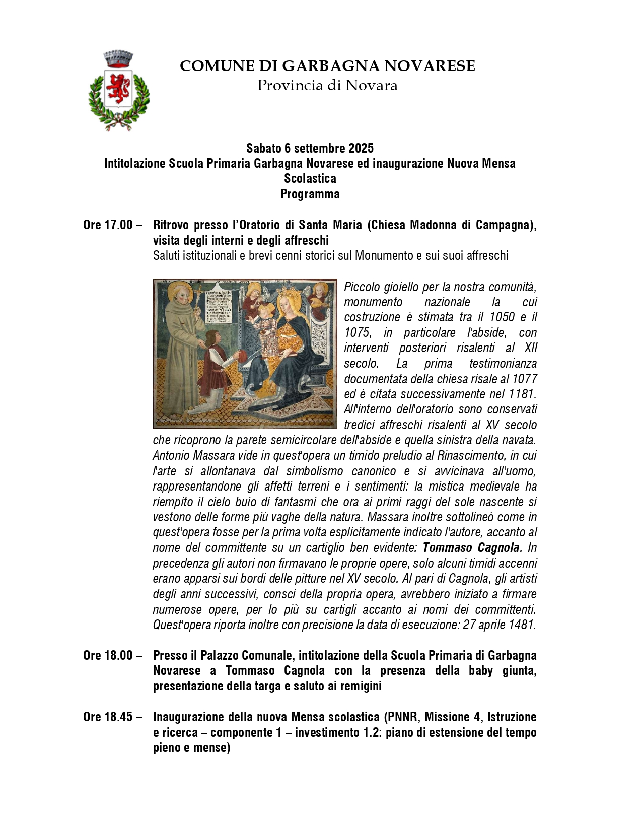 Si invita la cittadinanza all' inaugurazione Nuova Mensa Scolastica ed intitolazione scuola Primaria di Garbagna Novarese
