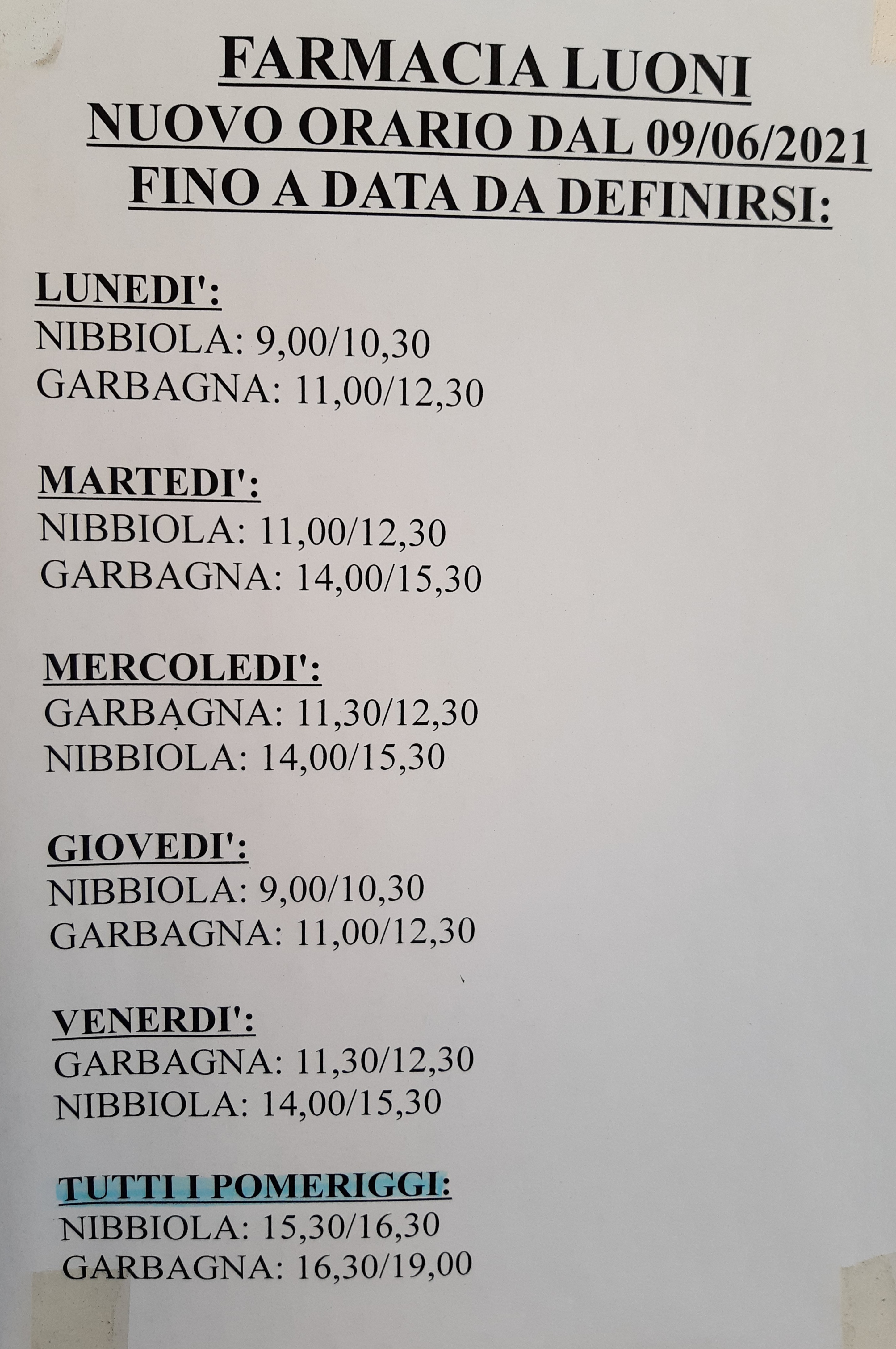 Si avvisa la Cittadinanza che a partire dal 09 giugno u.s. il Dispensario Farmaceutico Luoni ha nuovi orari apertura, che saranno validi fino a data da definirsi.